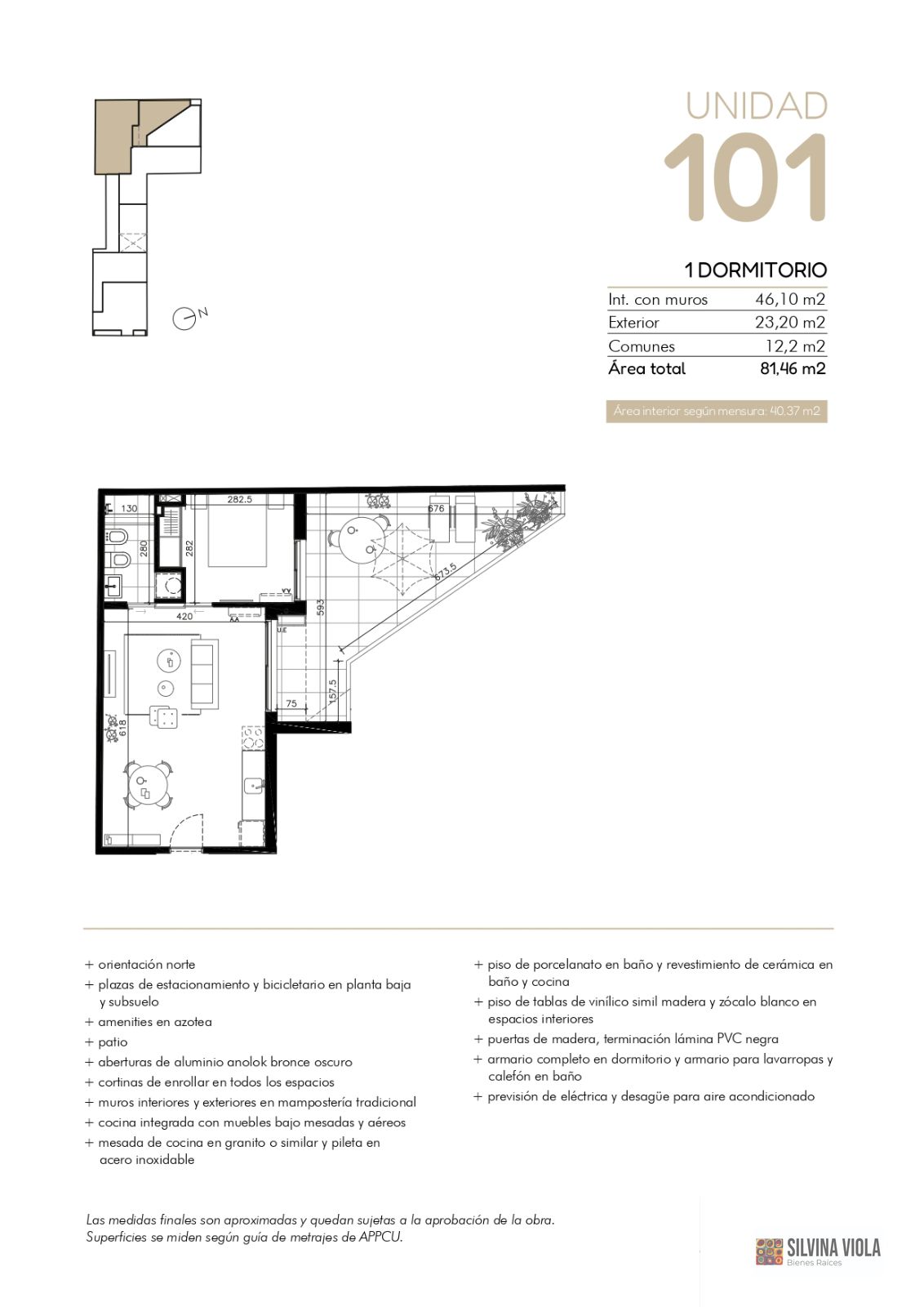 Departamento 1 dormitorio ubicado sobre la calle Juan Paullier, en el barrio de Cordón, Montevideo. Situado en el piso 1 de un edificio de 10 pisos. Cuenta con una superficie total construida de 46,10 mts. internos y 23,20 exteriores : una terraza al frente (con desagüé para lavarropa) y una terraza al fondo. (Ver plano). Distribuido en living con cocina integrada al frente. Terraza al frente. 1 baño, 1 Dormitorio con armario completo y otro independiente para el calefón. Muros interiores en mampostería tradicional. Cocina integrada con muebles bajo mesada y aéreos. . Previsión eléctrica para desagüe para aire acondicionado. AMENITIES – Salón cerrado con parrillero, kitchenette, y equipamiento de uso común. – Amplias terrazas. – Laundry. Todos los beneficios fiscales de la Ley de Promoción de Vivienda COSTOS – Comisión inmobiliaria: 3% + IVA – Gastos de ocupación: 4% – Garajes disponibles por U$S 19.000(2-3-9-10) y U$S 21.000 (1-8) FORMA DE PAGO – Compromiso 40% – Cuotas obra 50% – Ocupación 10% Entrega prevista : MARZO 2027 Desarrolla Bangkok Group. Compartimos con todos los colegas inmobiliarios. No dudes en consultarnos!